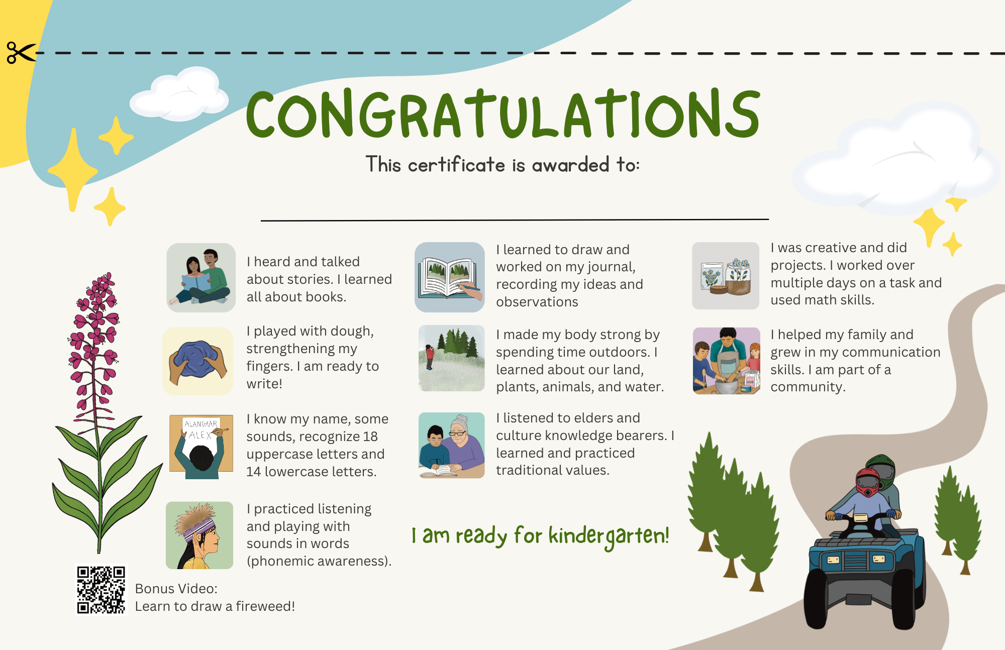 The Kindergarten Readiness Summer Play Guide offers families a fun, flexible way to prepare children for school while staying connected to the land, culture, and seasonal activities of Alaska. Designed for the weeks between May and August, the guide provides one themed activity for each week—rooted in Dena’ina and Yup’ik month names, subsistence harvesting, and local knowledge of plants, animals, and the environment.