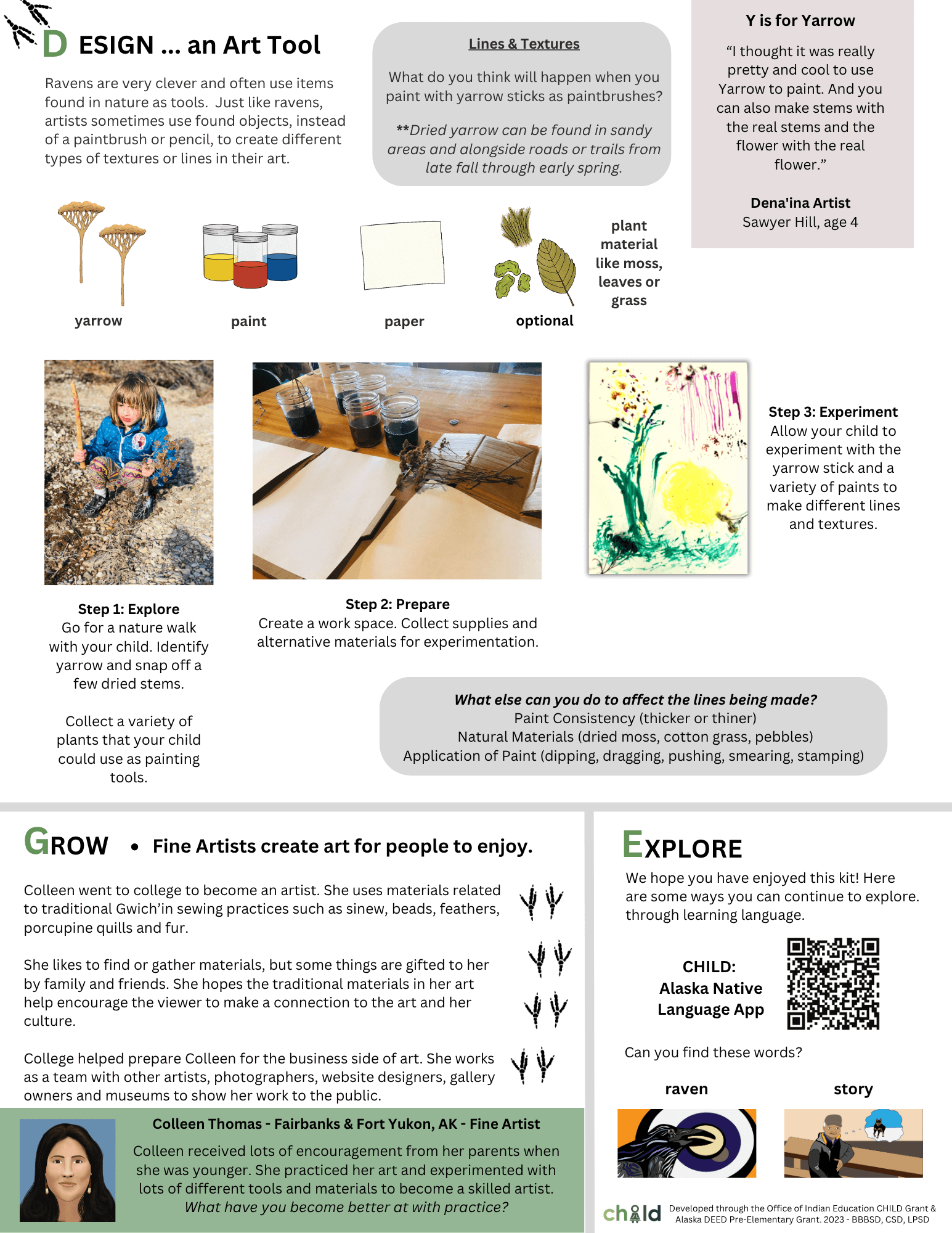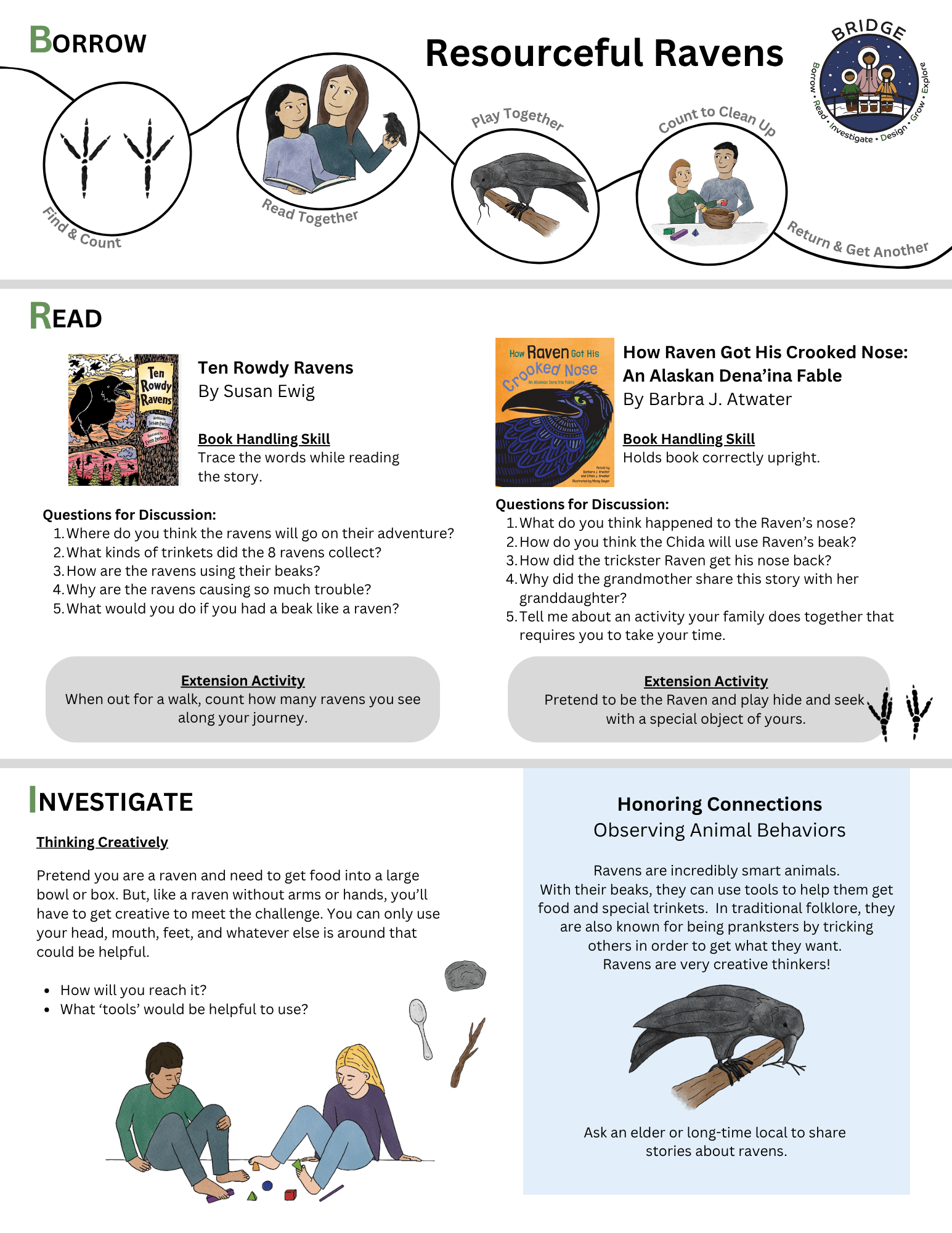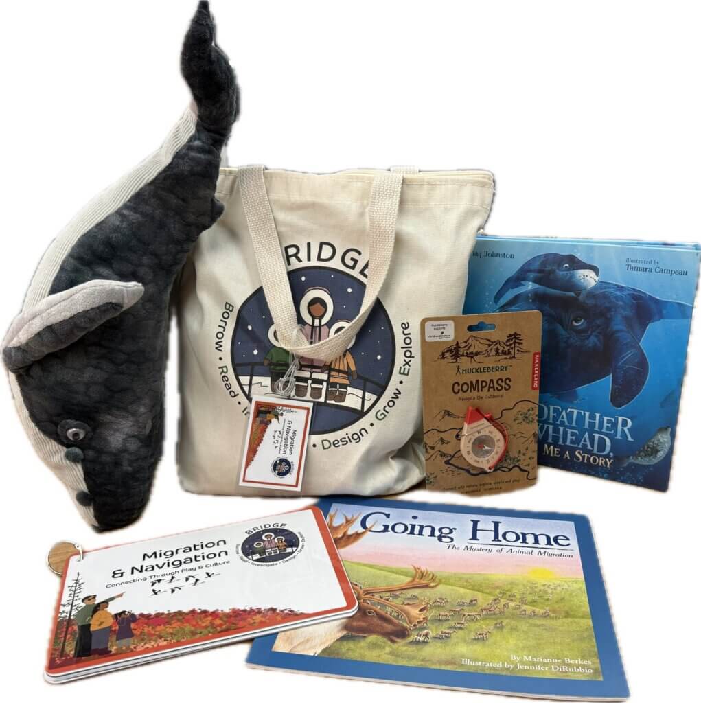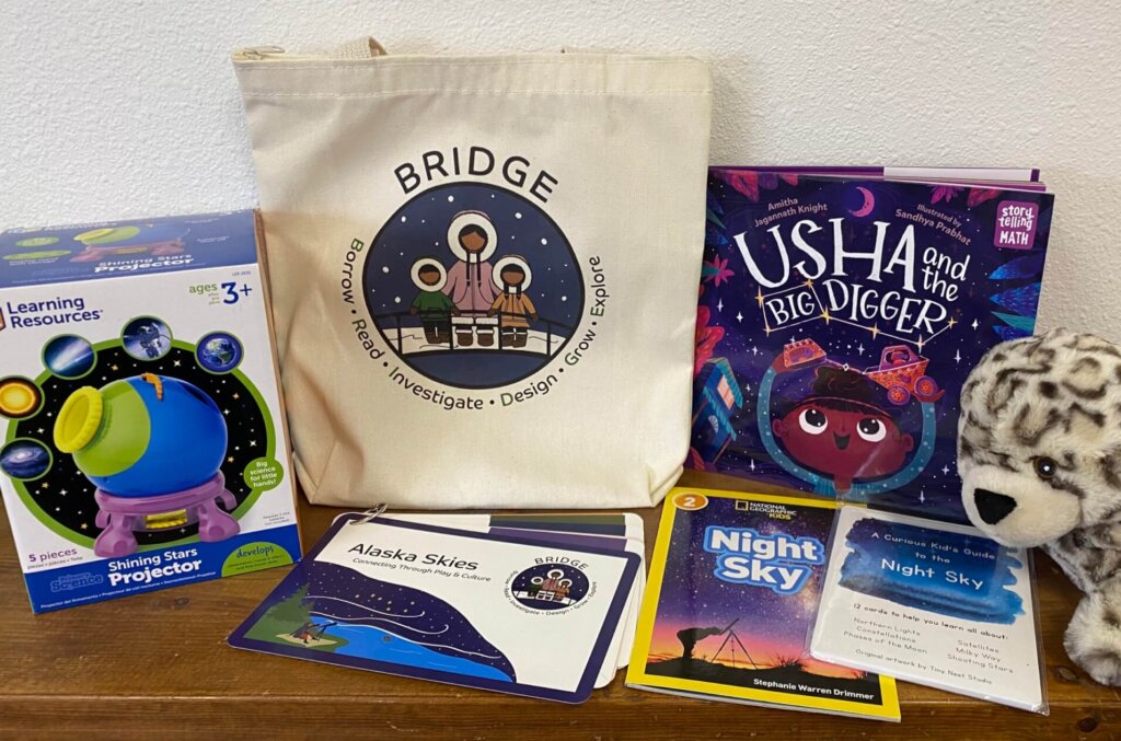 Our BRIDGE Family Literacy Kits are designed to help families read, explore, and learn together while connecting literacy to Alaska’s land, culture, and community. Each kit follows the BRIDGE framework—Borrow, Read, Investigate, Design, Grow, Explore—so families can enjoy meaningful stories, hands-on activities, and creative challenges.