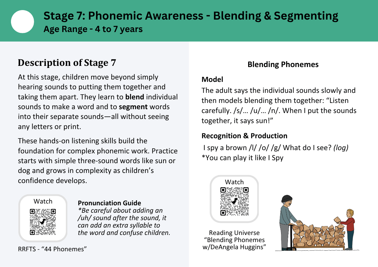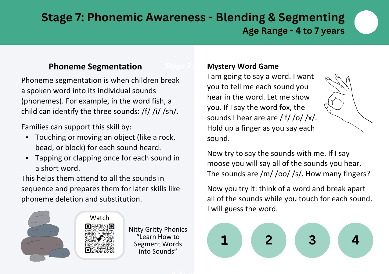 These cards were developed through the Pre-Elementary Grant (2023–2026) to help families and educators support early listening and sound awareness skills that form the foundation for reading. Each stage offers simple, playful ways to explore language through videos, resources, and activities. Print – Laminate – Put on a Ring.
