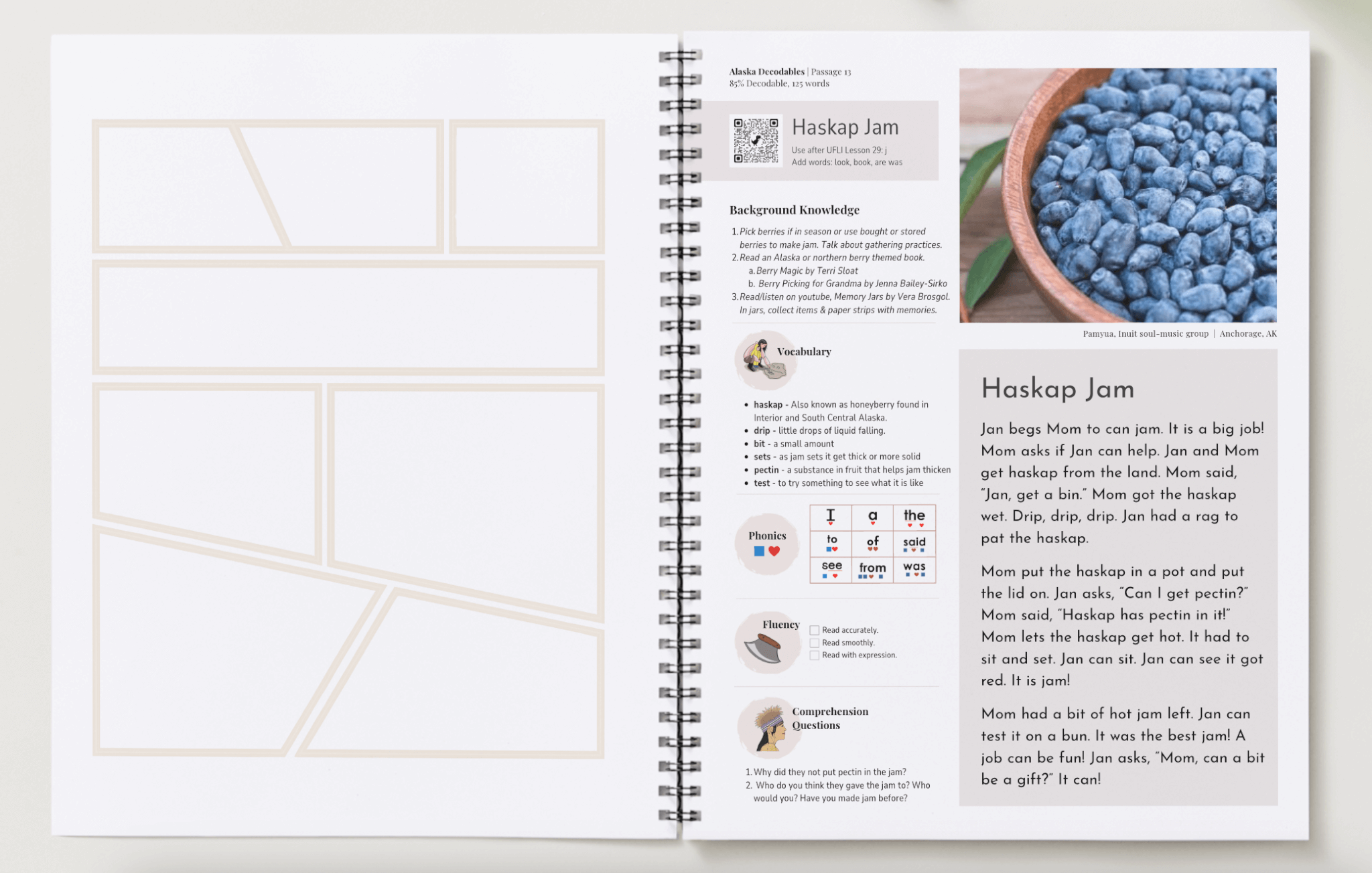 Written at approximately 70–90% decodability, the passages support developing readers while strengthening foundational skills through meaningful Alaska-centered content. Students demonstrate comprehension by illustrating each passage, with comic style options.