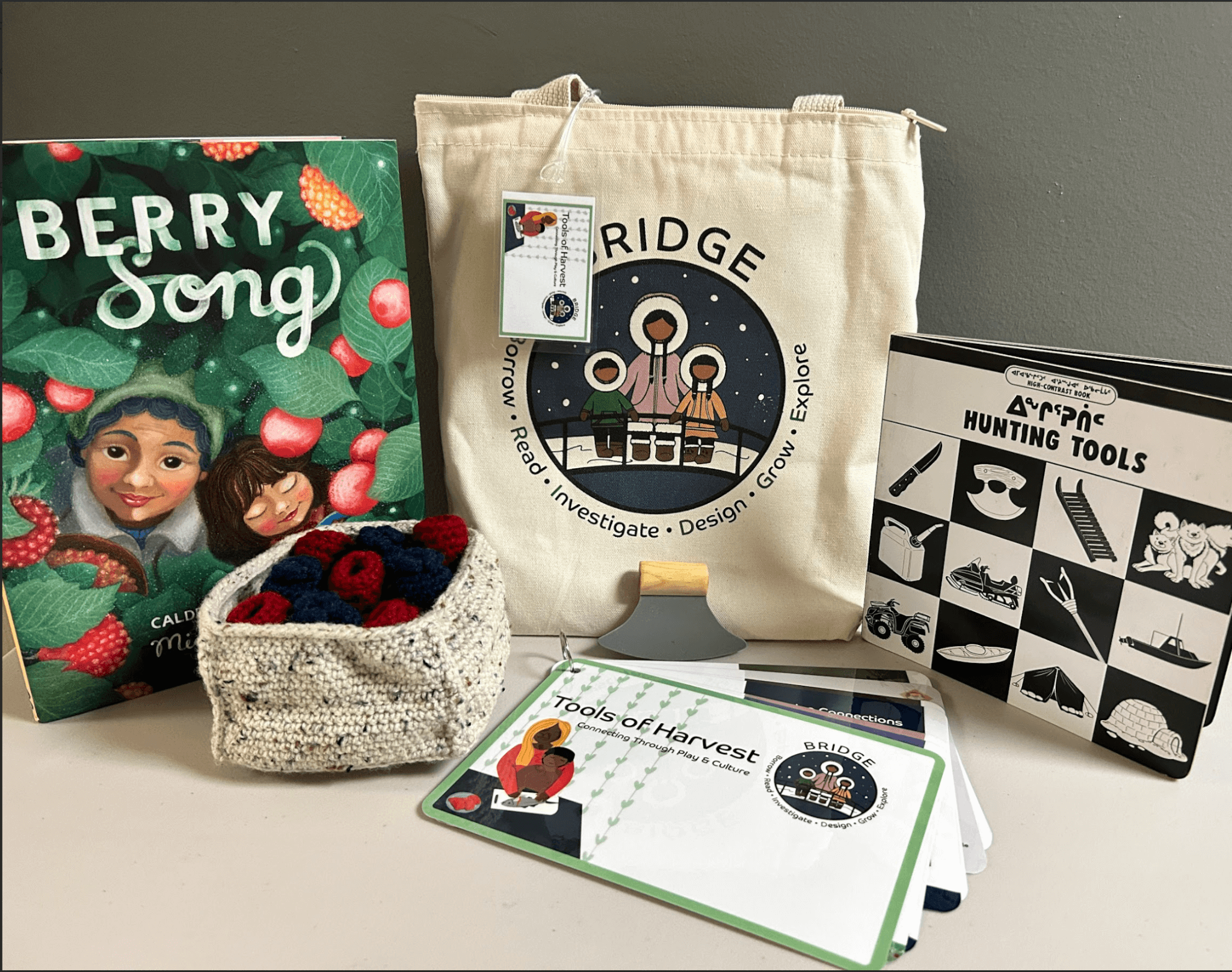 Family literacy bags include one informational book, one story rooted in Alaska or northern Indigenous themes, and a set of custom-developed cards featuring a STEM project.